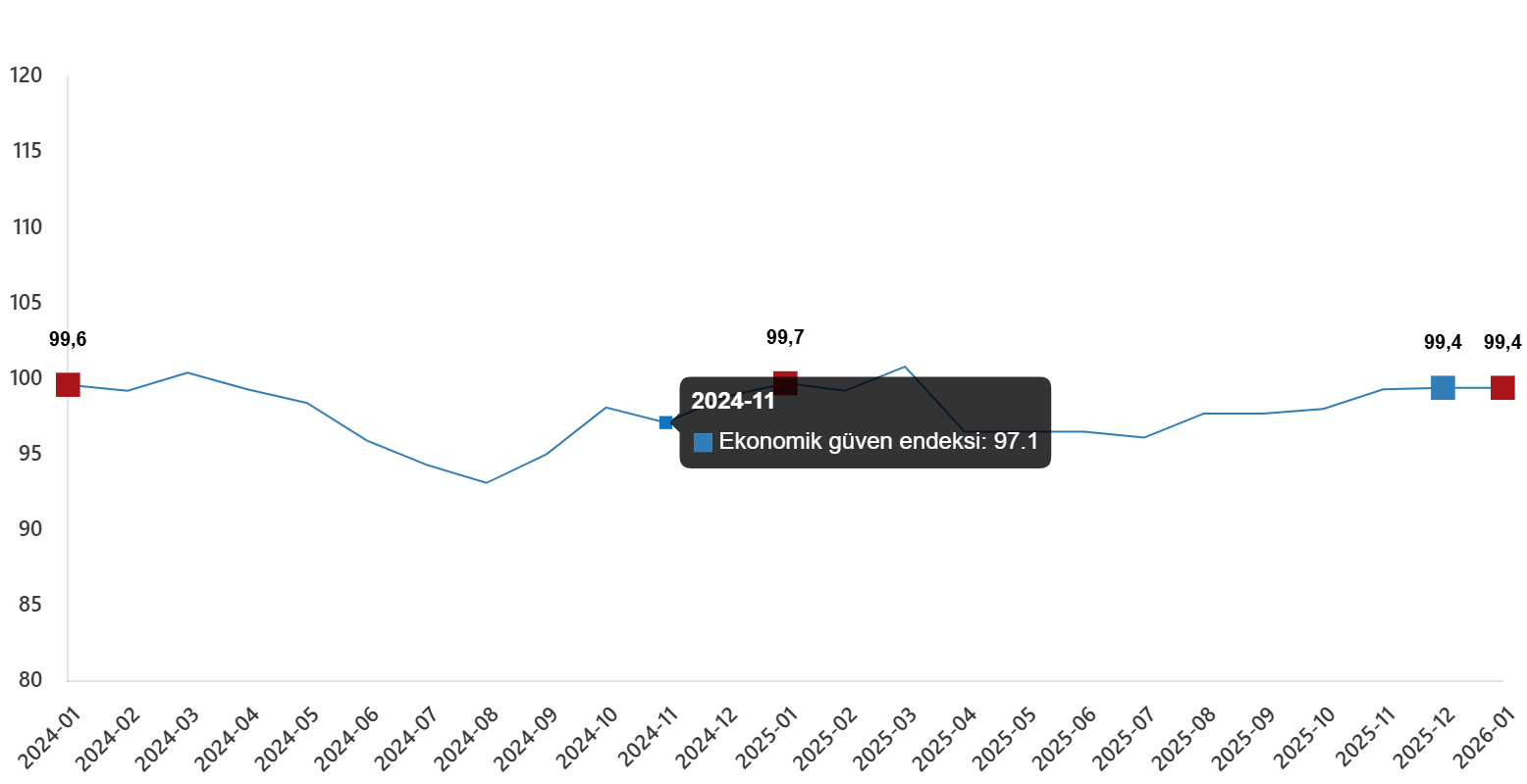Ekonomik inanç endeksi Ocak ayında birebir seviyede kalarak 99,4 bedelini aldı.