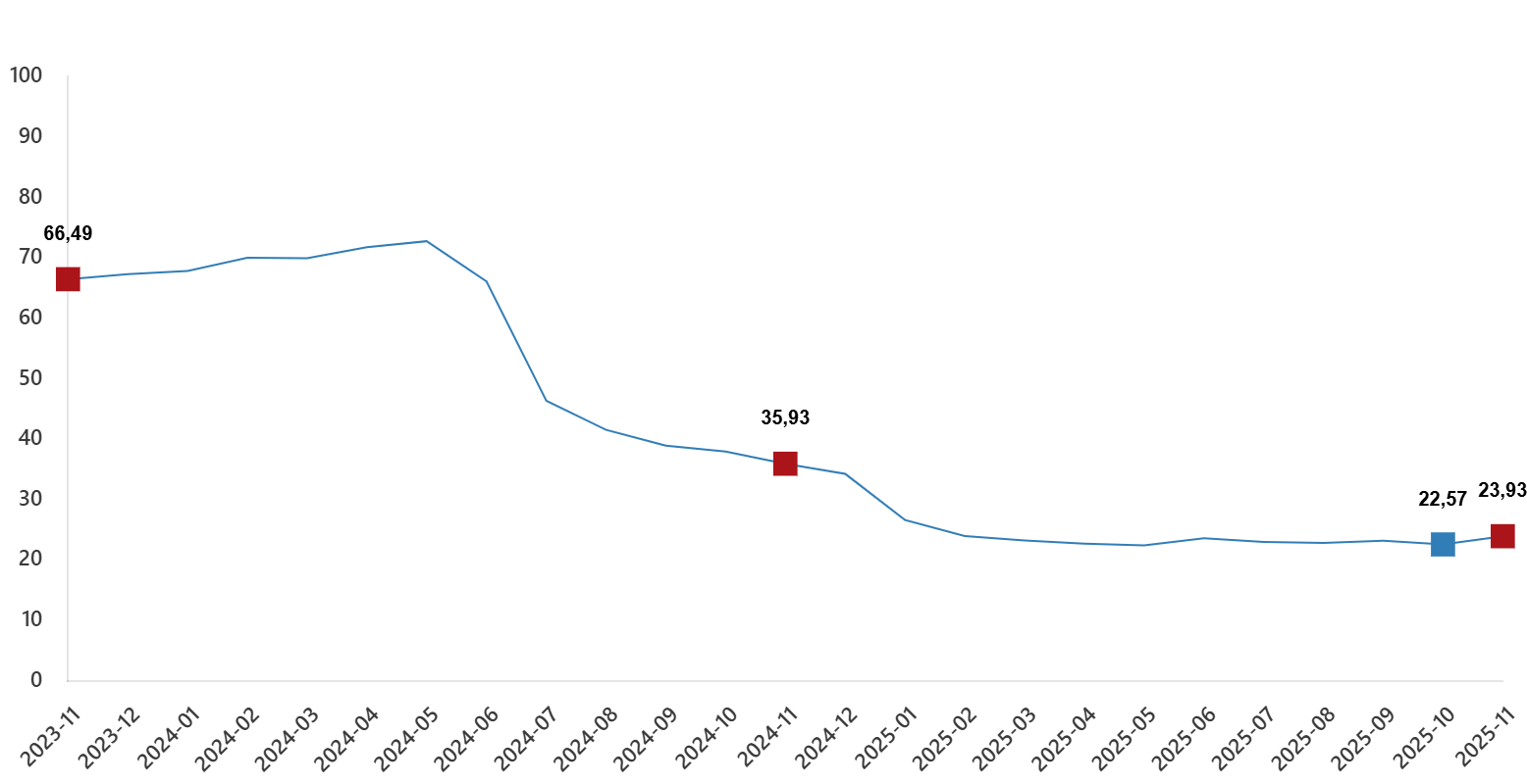 İnşaat maliyet endeksi, 2025 yılı Kasım ayında bir evvelki aya nazaran %1,14 arttı, bir evvelki yılın tıpkı ayına nazaran %23,93 arttı. Bir evvelki aya nazaran gereç endeksi %1,70 arttı, personellik endeksi %0,12 arttı. Ayrıyeten bir evvelki yılın tıpkı ayına nazaran gereç endeksi %20,48 arttı, personellik endeksi %30,98 arttı.