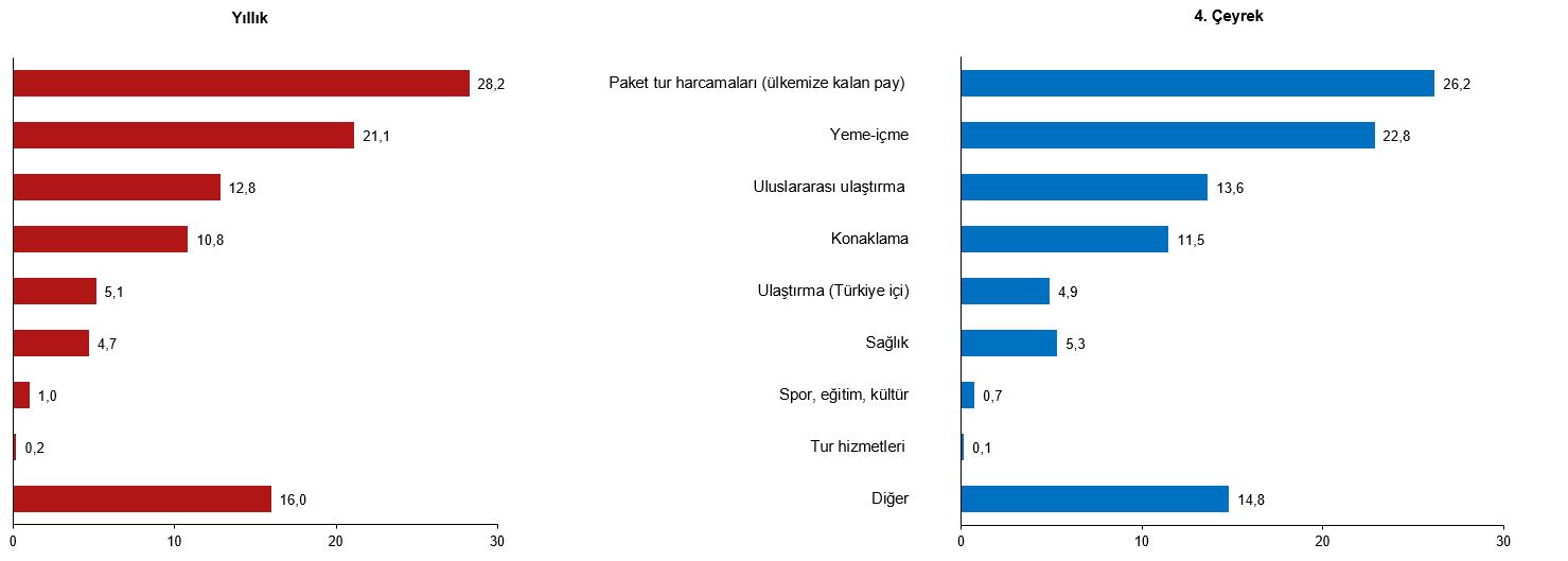Bu çeyrekte ziyaretçilerden elde edilen turizm geliri içerisindeki paket cins harcamalarının hissesi %26,2, yeme içme harcamalarının hissesi %22,8, milletlerarası ulaştırma harcamalarının hissesi ise %13,6 oldu. Bir evvelki yılın tıpkı çeyreğine nazaran paket çeşit harcamaları %5,5, yeme içme harcamaları %20,8 ve memleketler arası ulaştırma harcamaları %15,2 arttı.